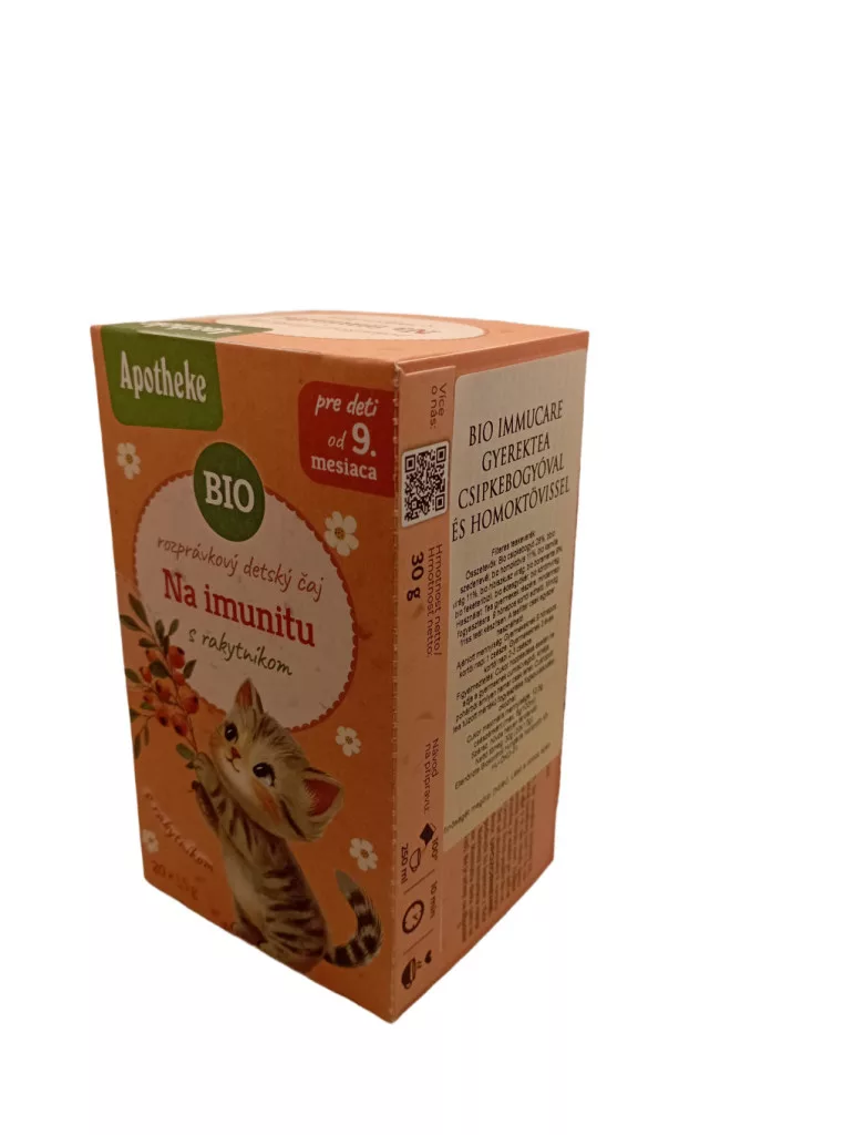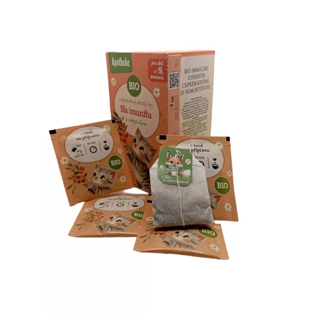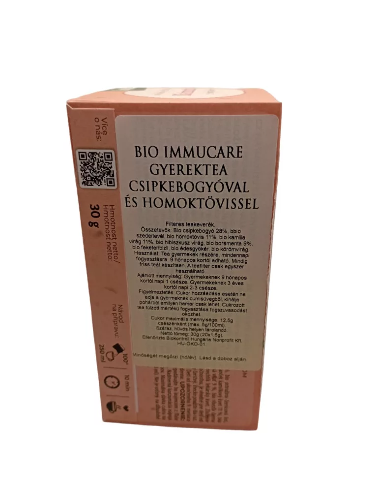 A BIO ImmuCare Gyerektea – Csipkebogyóval és Homoktövissel egy gondoskodó, természetes gyermektea, amely kifejezetten az immunrendszer erősítésére készült. A teakeverék bio alapanyagokból áll, így a gyermekek számára biztonságos, tiszta és természetes támogatást nyújt a mindennapokban, különösen a megfázásos időszakokban vagy gyengébb napokon.